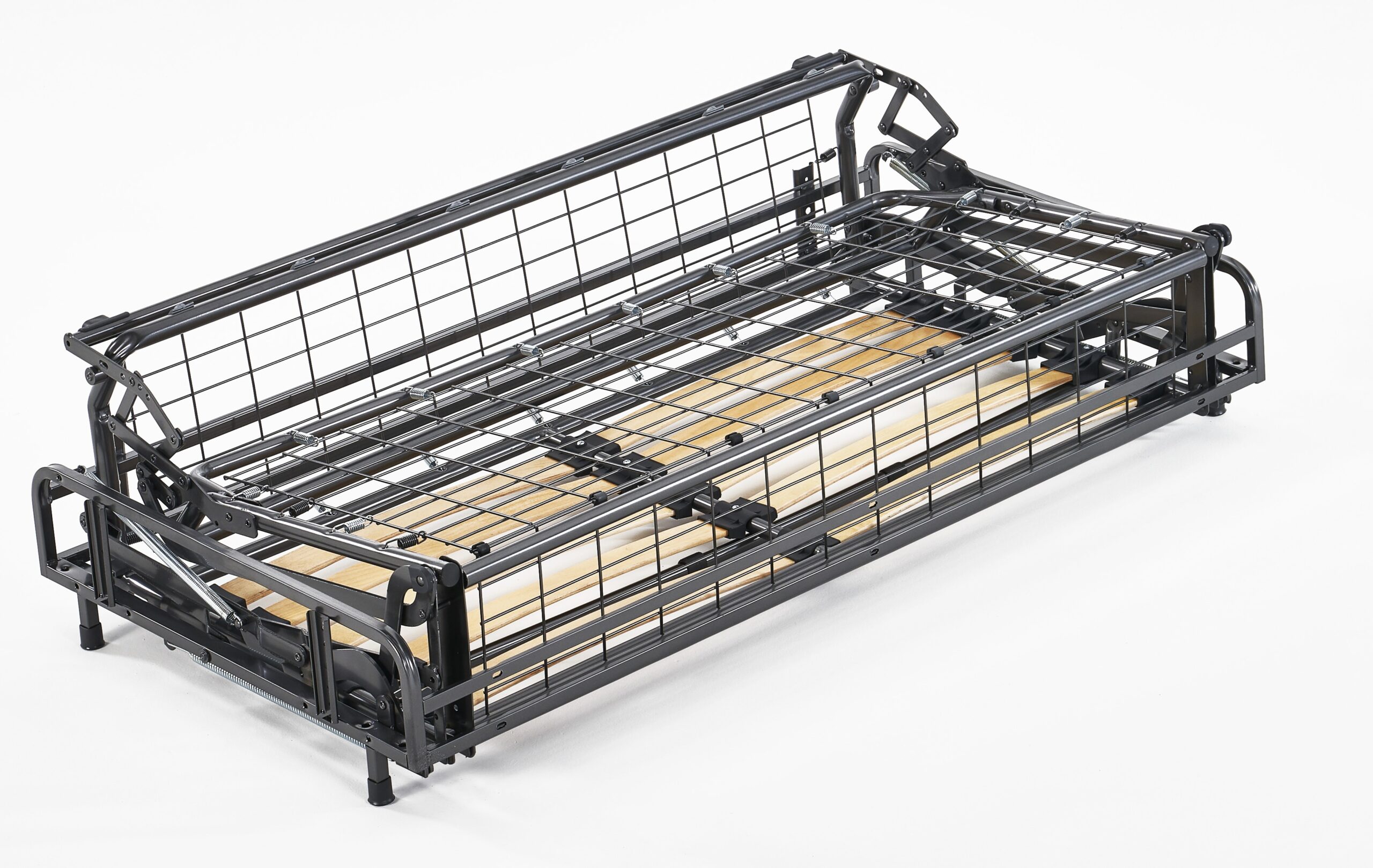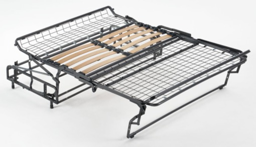 ed è disponibile in doga larga e doppia doga. Nel piano di seduta possono essere montate a scelta del cliente le cinghie elastiche oppure il pannello elettrosaldato. Il meccanismo Grecale certificato CATAS può ospitare un’ampia scelta di confortevoli materassi in poliuretano e memory di 14 cm di altezza.