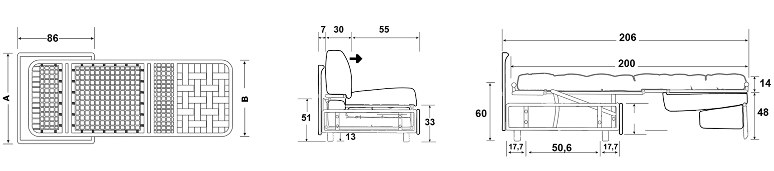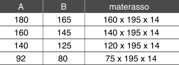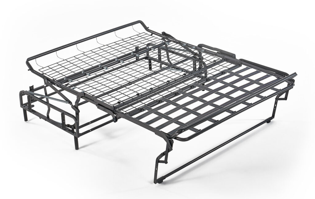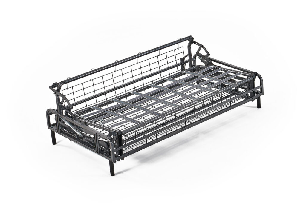 ed è disponibile in doga larga e doppia doga. Nel piano di seduta possono essere montate a scelta del cliente le cinghie elastiche oppure il pannello elettrosaldato. Il meccanismo Grecale certificato CATAS può ospitare un’ampia scelta di confortevoli materassi in poliuretano e memory di 14 cm di altezza.