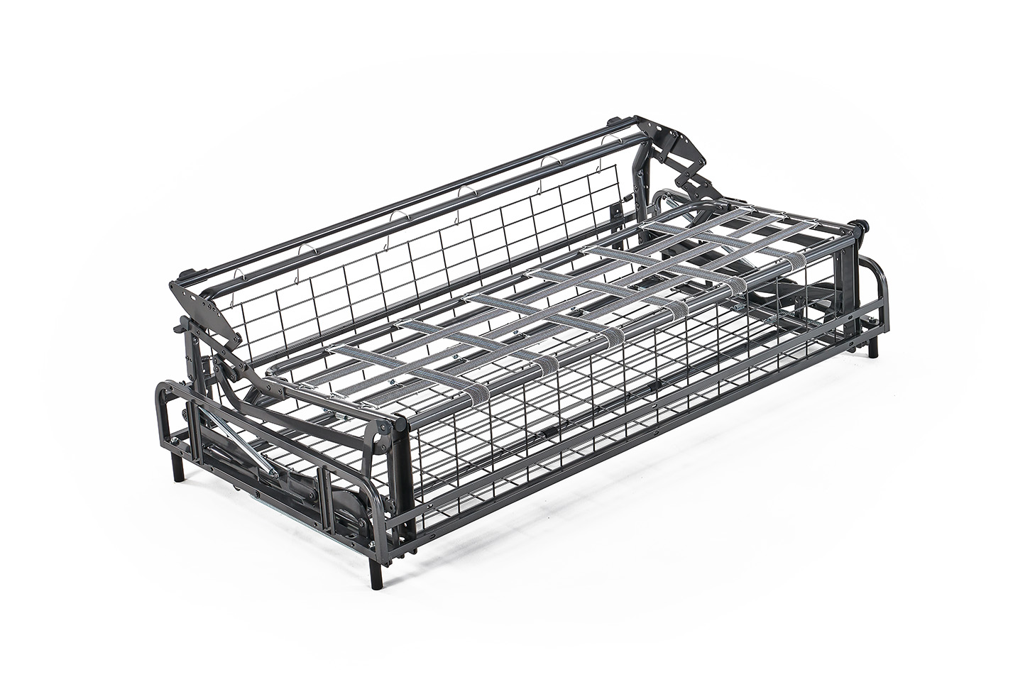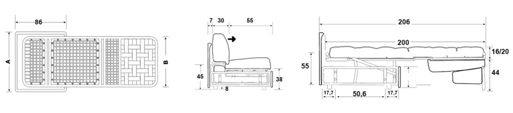 La rete Levante è un meccanismo certificato CATAS che, mediante agevole rotazione dello schienale e successivo svolgimento della rete, si trasforma in un comodo letto senza la necessità di rimuovere i cuscini della seduta e dello schienale. La rete è realizzata in acciaio ad alta resistenza con un telaio portante già predisposto con baionette per il rapido montaggio di braccioli e schienale. Il piano letto ortopedico è solido, stabile e confortevole, particolarmente adatto all’uso frequente e quotidiano, ed è disponibile in doga larga e doppia doga. Nel piano di seduta possono essere montate a scelta del cliente cinghie elastiche oppure il pannello elettrosaldato. Il meccanismo Levante certificato CATAS può ospitare un’ampia scelta di confortevoli materassi in poliuretano e memory di 16/20 cm di altezza.