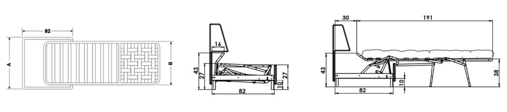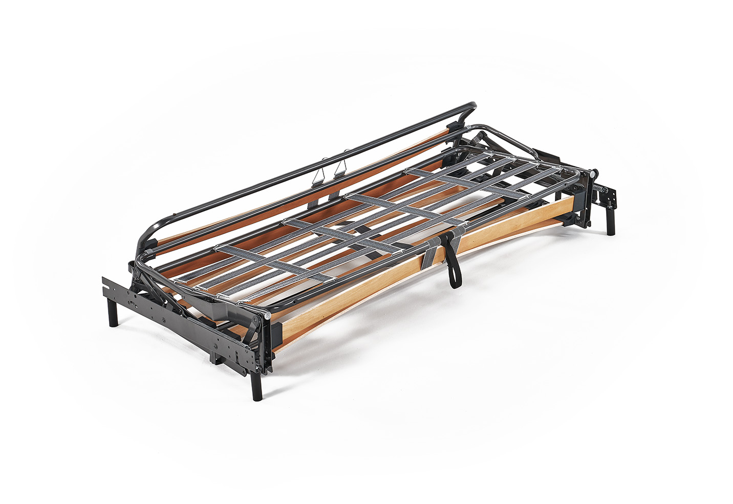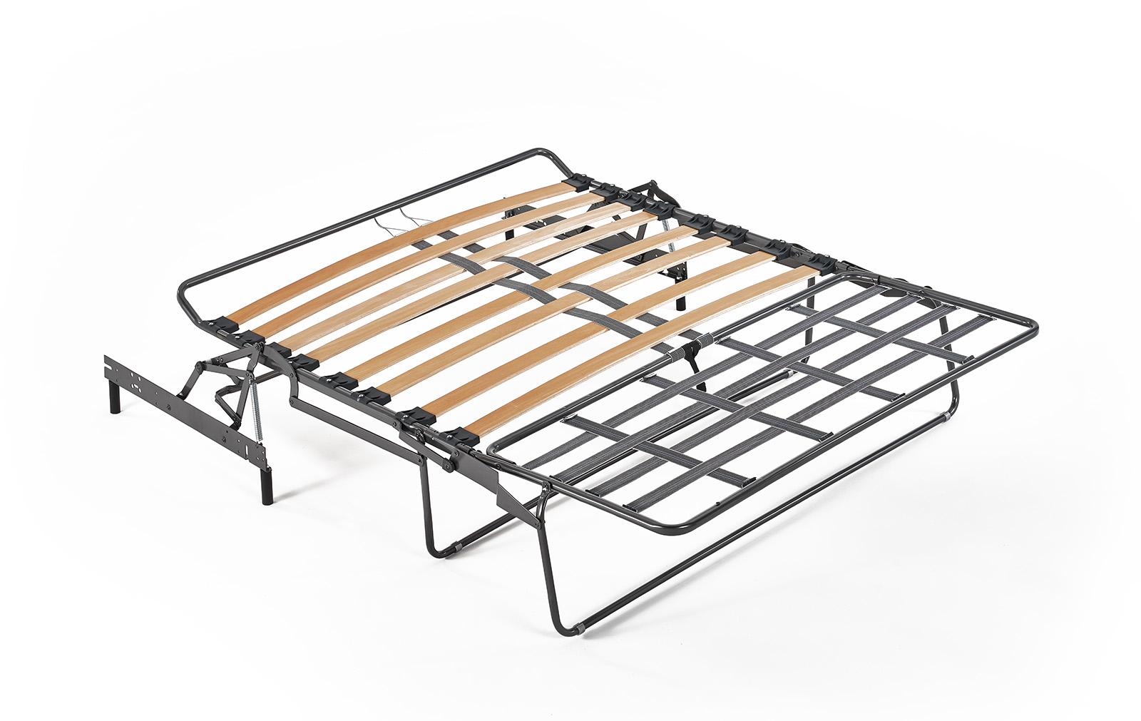 La rete Scirocco studiata per la grande distribuzione è realizzata in acciaio ad alta resistenza ed è montata su un telaio portante già predisposto per il fissaggio del fusto del divano. Il piano letto è realizzato in doghe in legno. Le doghe sono sostituite da cinghie elastiche nella zona che con meccanismo chiuso diviene piano di seduta. La rete può ospitare varie tipologie di materasso in poliuretano, da 10 e 12 cm di altezza e 190 cm di lunghezza. Il meccanismo è facilmente apribile e richiudibile tramite una pratica maniglia in poliestere ad anello. Meccanismo da inserimento a 2 pieghe con apertura frontale tramite sollevamento. La struttura è verniciata a forno con polveri epossidiche.